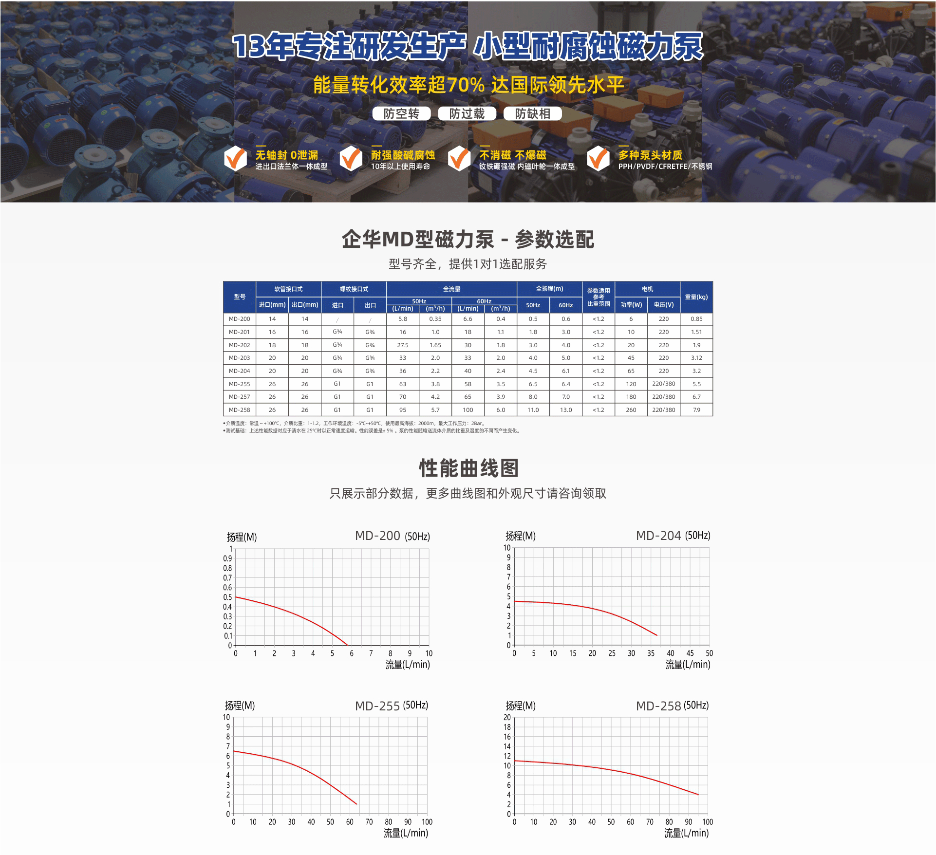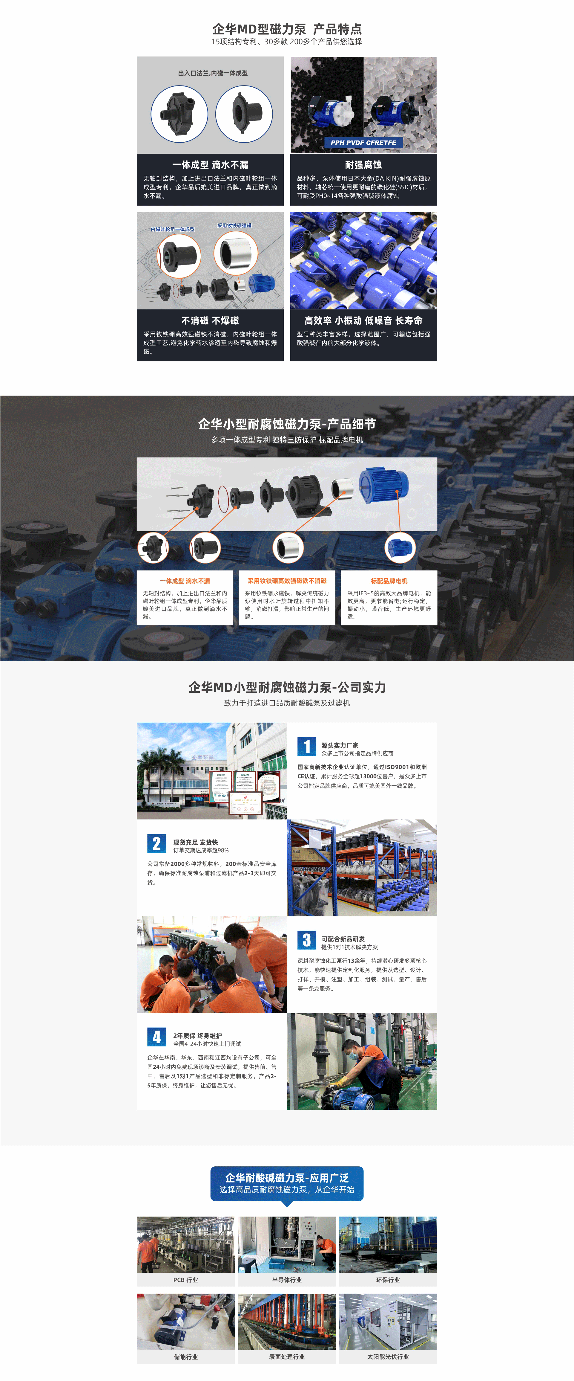 耐強腐蝕,進出口法蘭一體成型專利滴水不漏;采用釹鐵硼高效強磁不消磁,內磁葉輪一體成型不爆磁;多種泵頭材質、體積小、振動小、噪音低、壽命長
